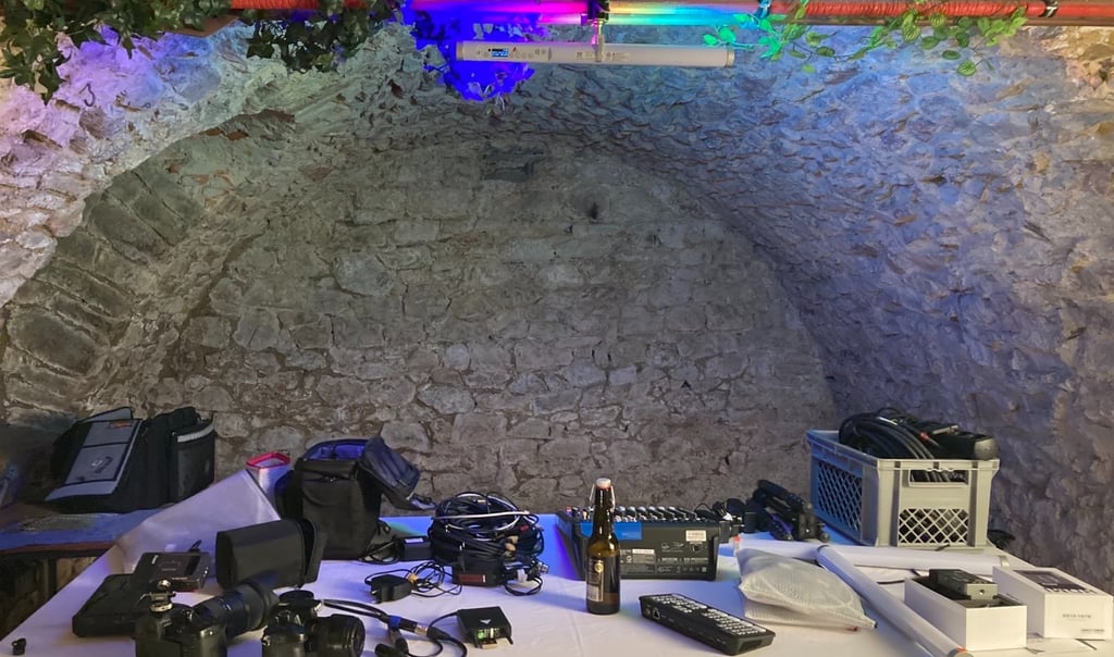 The crew had a projector for visuals, but for the previous livestream at this location they only projected onto the front of the mixing table.